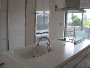 玄関ホールにはたっぷりの収納を作りました。2階はキッチンを中心に家族の顔がいつでも見える解放感あるれる空間になりました。