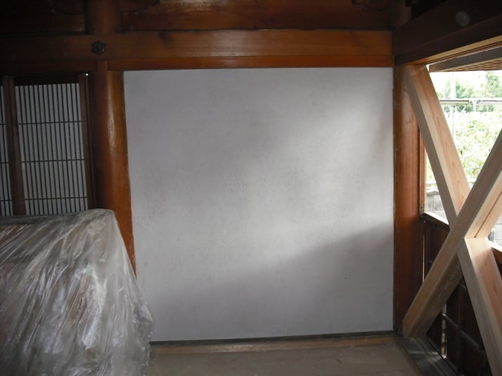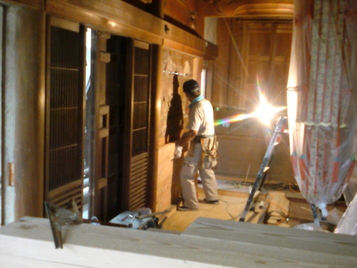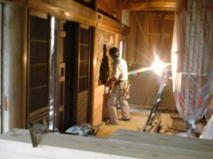 明治初期に建てられたお寺の本堂の屋根の葺き替え工事です。本堂自体かなり傾いていたのでそれをまっすぐに起こし、壁の耐震補強をしました。筋交いを取り払い、厚い板を壁全体に入れて強力な耐震壁にしました。開口部から光を取り入れるために横方向は筋交いで補強します。外部はジャッキで建物を起こし、補強用の鉄骨と本体を長いボルトで結びました。
